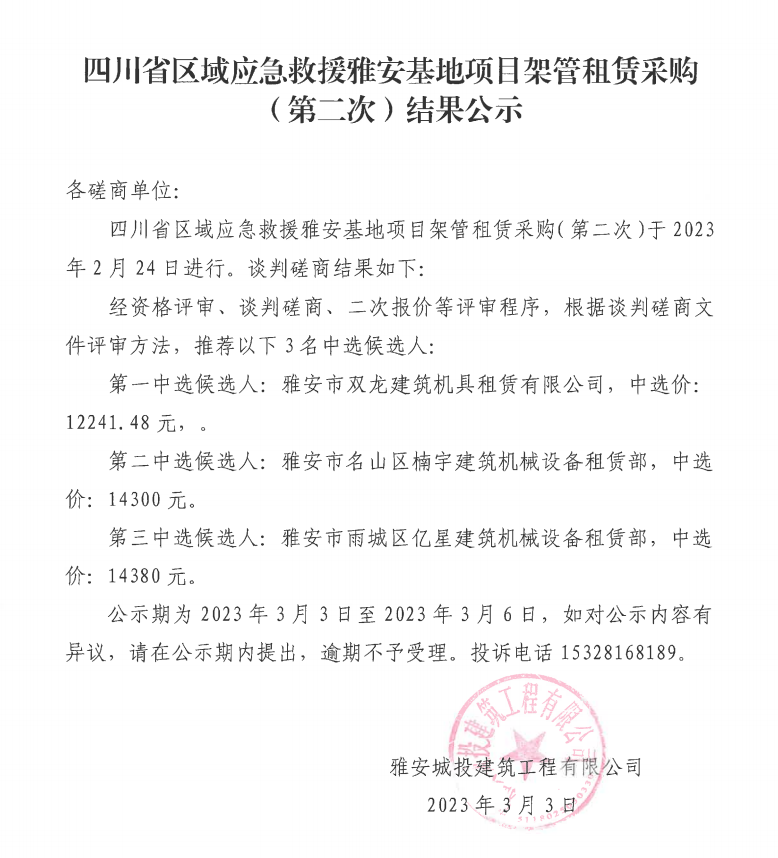 四川省區(qū)域應(yīng)急救援雅安基地項目架管租賃采購(第二次)結(jié)果公示