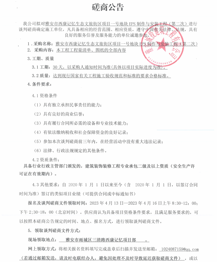 雅安市西康記憶生態(tài)文旅街區(qū)項目一號地塊項目EPS制作與安裝工程(第二次)采購談判磋商公告