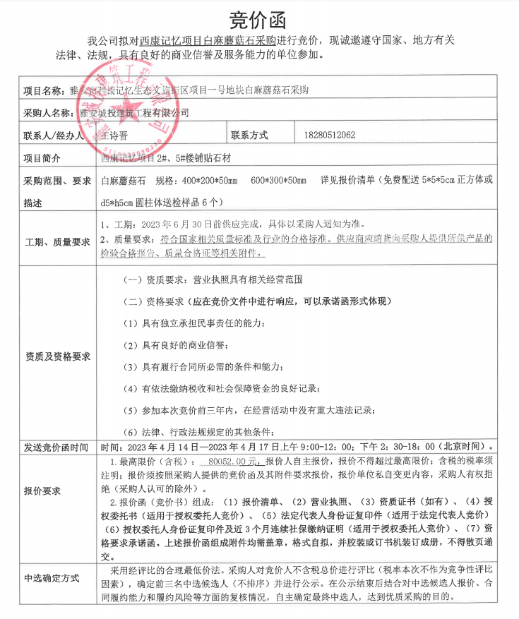 雅安市西康記憶生態(tài)文旅街區(qū)項(xiàng)目一號地塊白麻蘑菇石競價采購公告