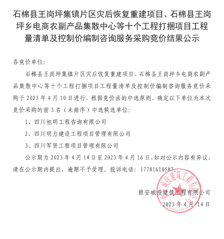 石棉縣王崗坪集鎮(zhèn)片區(qū)災(zāi)后恢復(fù)重建項目、石棉縣王崗坪鄉(xiāng)電商農(nóng)副產(chǎn)品集散中心等十個工程打捆項目工程量清單及控制價編制咨詢服務(wù)采購競價結(jié)果公示