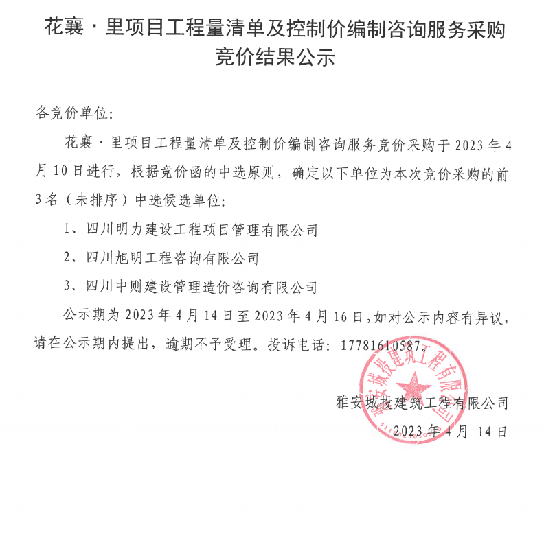 花襄·里項(xiàng)目工程量清單及招標(biāo)控制價(jià)編制咨詢服務(wù)采購競(jìng)價(jià)結(jié)果公示