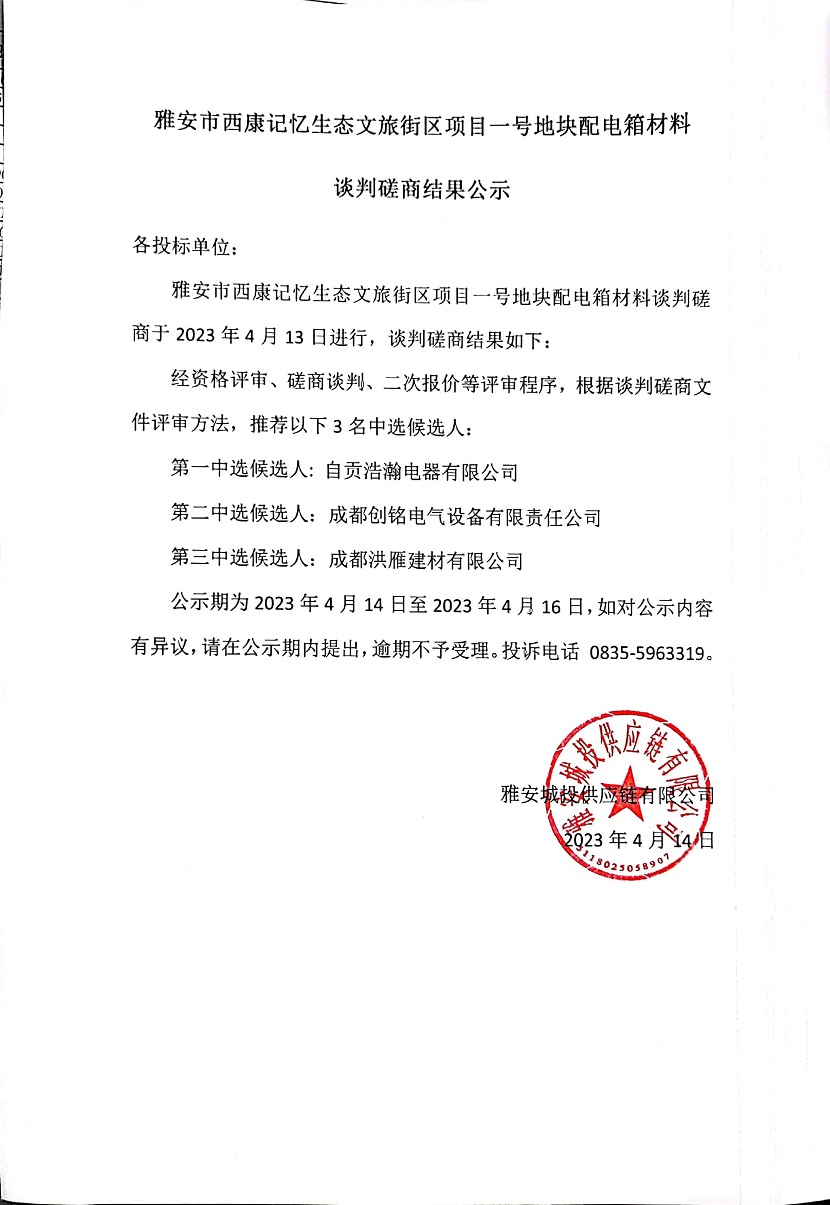 雅安市西康記憶生態(tài)文旅街區(qū)項目一號地塊配電箱材料談判磋商結果公示