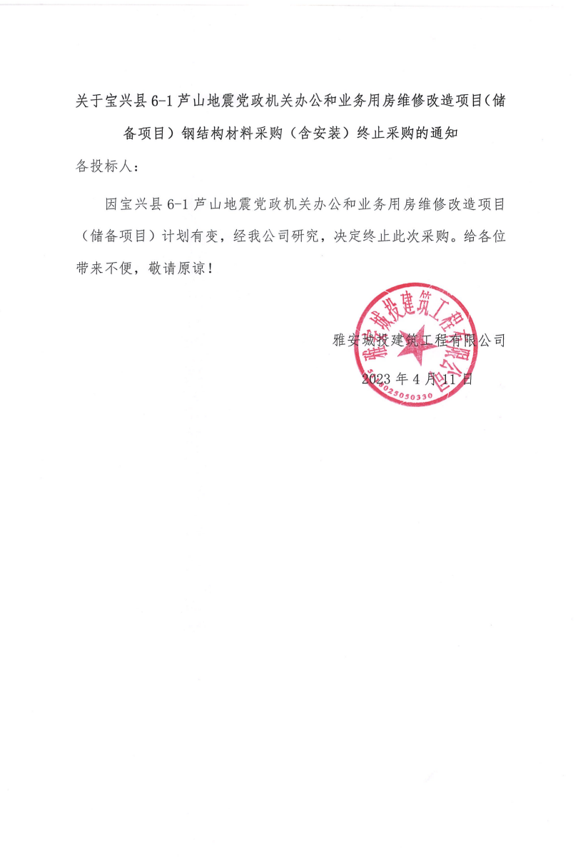 關(guān)于寶興縣6-1蘆山地震黨政機(jī)關(guān)辦公和業(yè)務(wù)用房維修改造項(xiàng)目(儲(chǔ)備項(xiàng)目)鋼結(jié)構(gòu)材料采購(含安裝)終止采購的通知