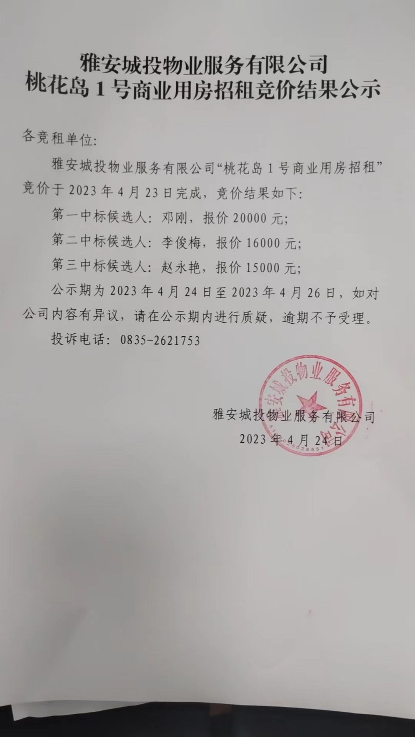 雅安城投物業(yè)服務(wù)有限公司桃花島1號商業(yè)用房招租競價結(jié)果公示