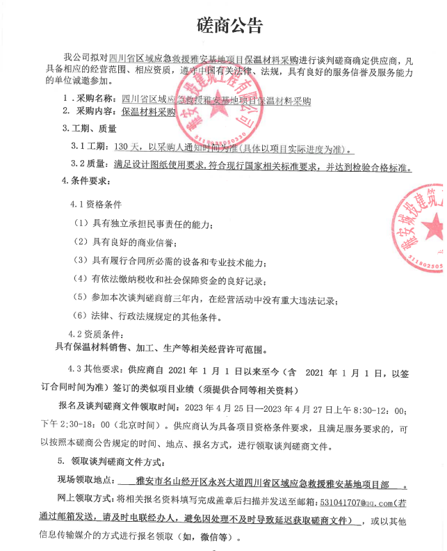 四川省區(qū)域應急救援雅安基地項目保溫材料采購談判磋商公告