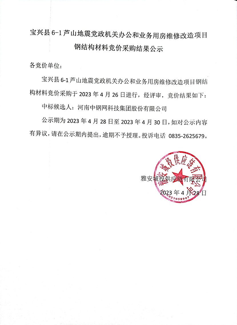 寶興縣6-1蘆山地震黨政機(jī)關(guān)辦公和業(yè)務(wù)用房維修改造項目鋼結(jié)構(gòu)材料競價采購結(jié)果公示