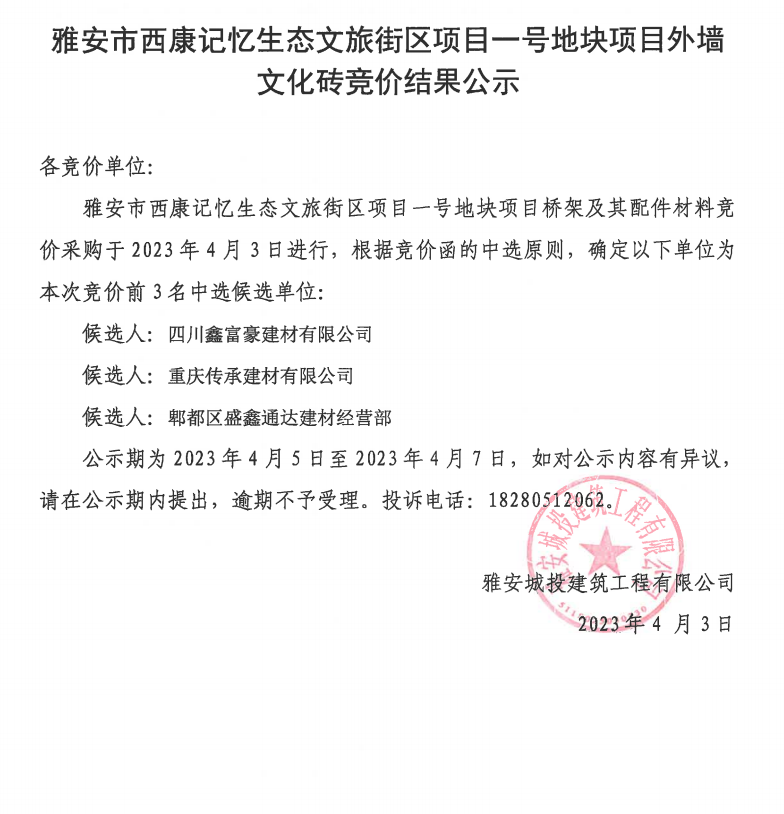 雅安市西康記憶生態(tài)文旅街區(qū)項(xiàng)目一號(hào)地塊項(xiàng)目外墻文化磚競(jìng)價(jià)結(jié)果公示