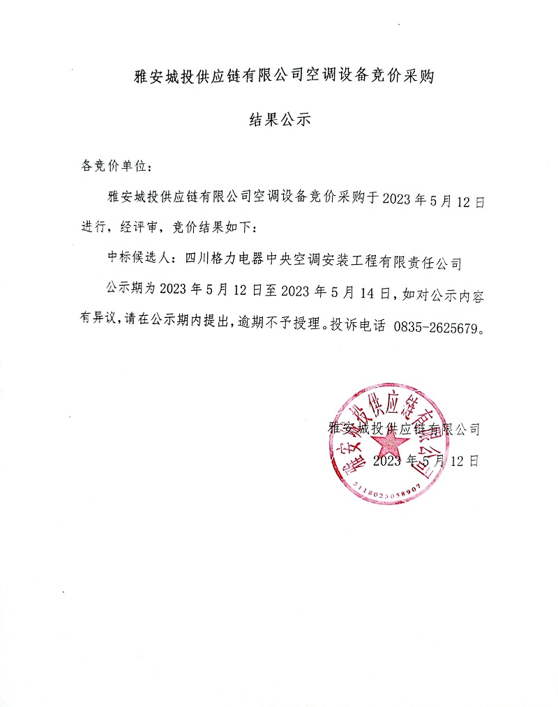 雅安城投供應(yīng)鏈有限公司空調(diào)設(shè)備競(jìng)價(jià)采購(gòu)結(jié)果公示