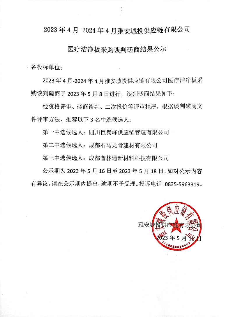 2023年4月-2024年4月雅安城投供應鏈有限公司醫(yī)療潔凈板采購談判磋商結(jié)果公示