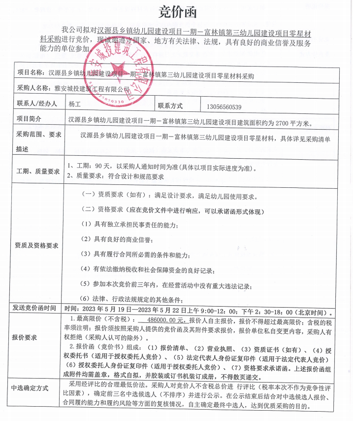 漢源縣鄉(xiāng)鎮(zhèn)幼兒園建設(shè)項(xiàng)目一期一富林鎮(zhèn)第三幼兒園建設(shè)項(xiàng)目零星材料采購競(jìng)價(jià)公告
