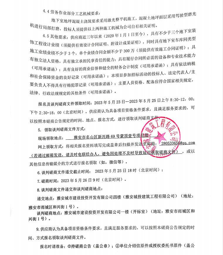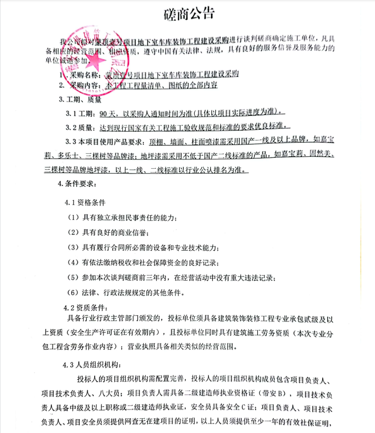 蒙頂壹號項目地下室車庫裝飾工程建設(shè)采購談判磋商公告