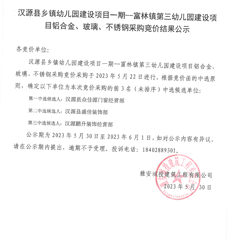 漢源縣鄉(xiāng)鎮(zhèn)幼兒園建設(shè)項目一期--富林鎮(zhèn)第三幼兒園建設(shè)項目鋁合金、玻璃、不銹鋼采購競價結(jié)果公示