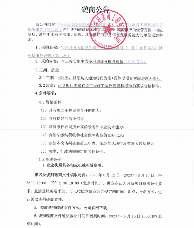 寶興縣靈關(guān)保障性租賃住房建設(shè)項目(二期)項目零星機械租賃服務采購(第二次)談判磋商公告