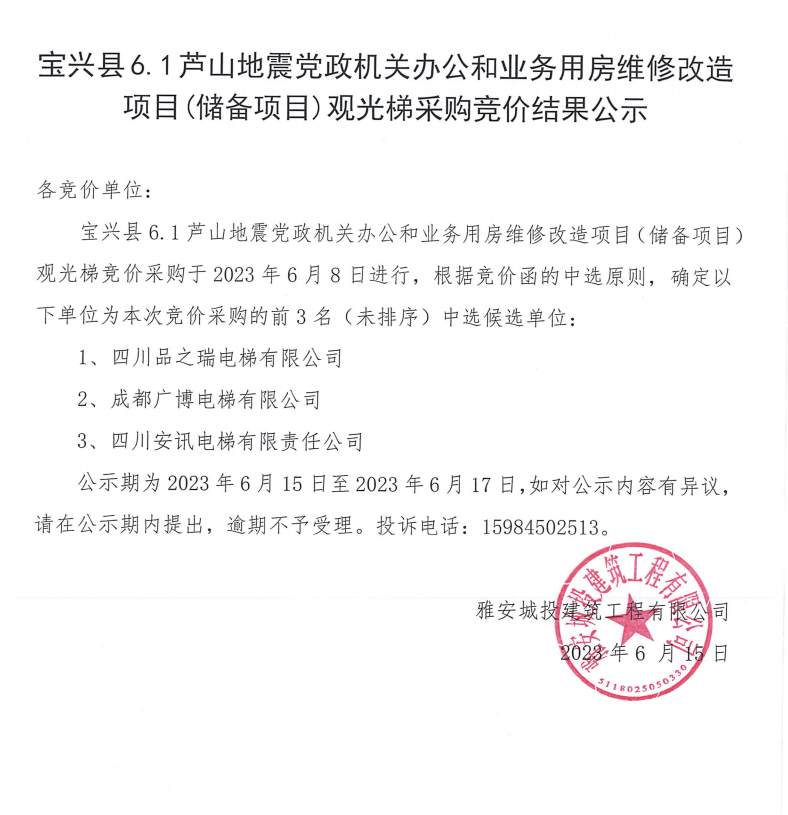 寶興縣6.1蘆山地震黨政機(jī)關(guān)辦公和業(yè)務(wù)用房維修改造項目(儲備項目)觀光梯采購競價結(jié)果公示