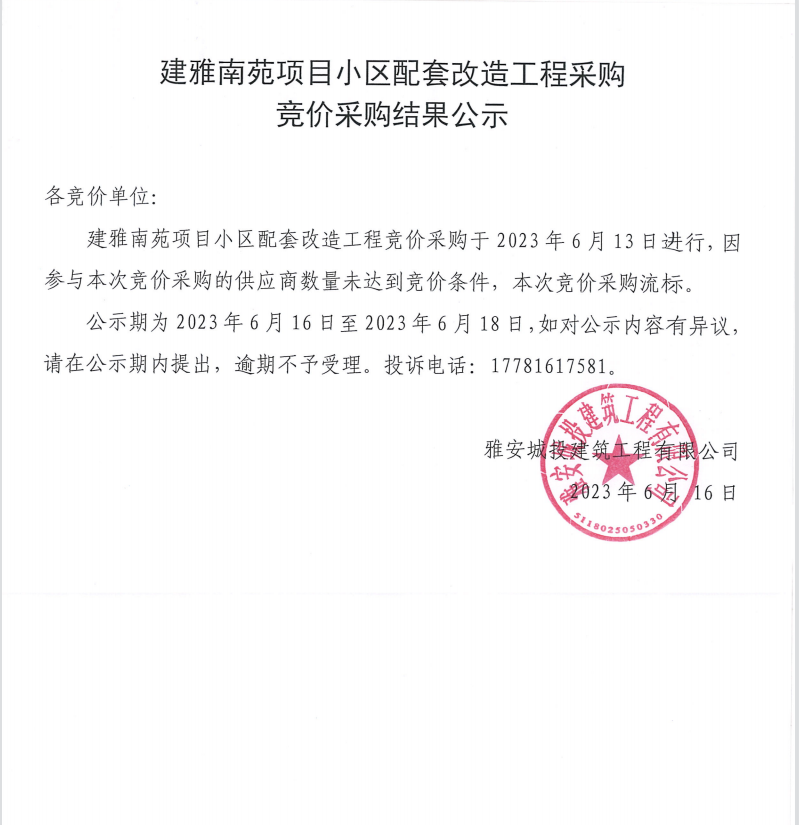 建雅南苑項目小區(qū)配套改造工程采購競價采購結(jié)果公示