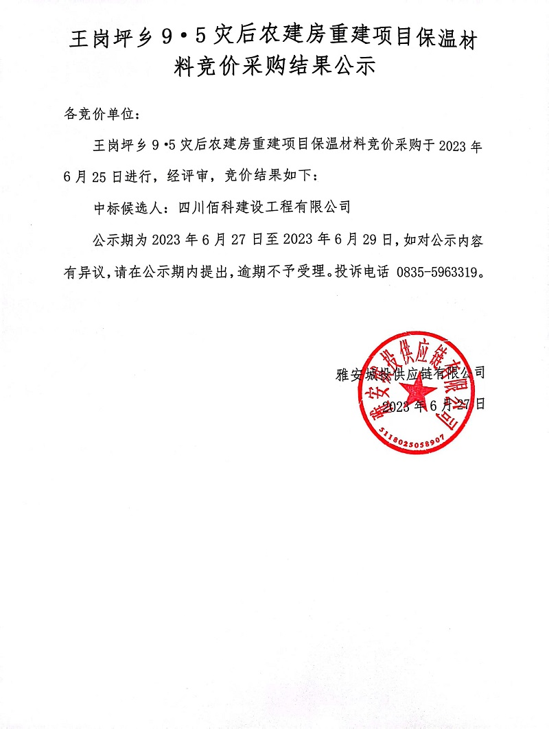 王崗坪鄉(xiāng)9·5災(zāi)后農(nóng)建房重建項(xiàng)目保溫材料競(jìng)價(jià)采購結(jié)果公示