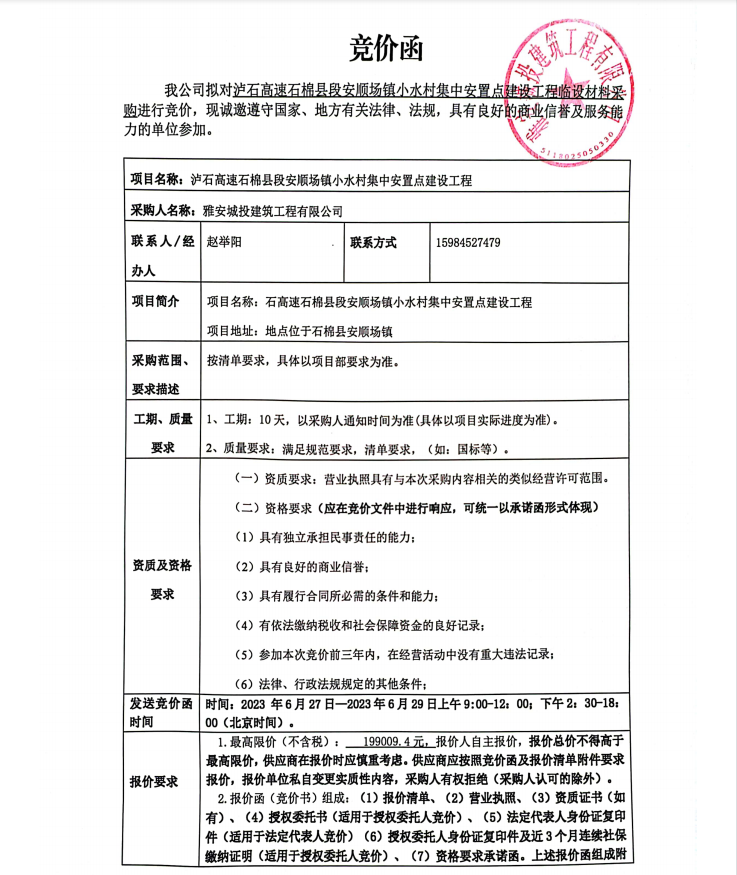 瀘石高速石棉縣段安順場(chǎng)鎮(zhèn)小水村集中安置點(diǎn)建設(shè)工程臨設(shè)材料采購競(jìng)價(jià)公告
