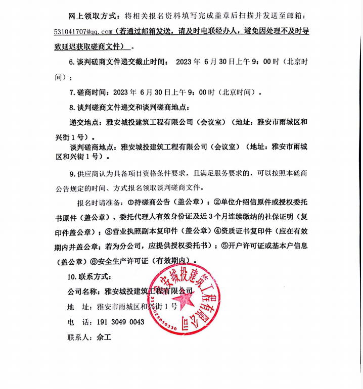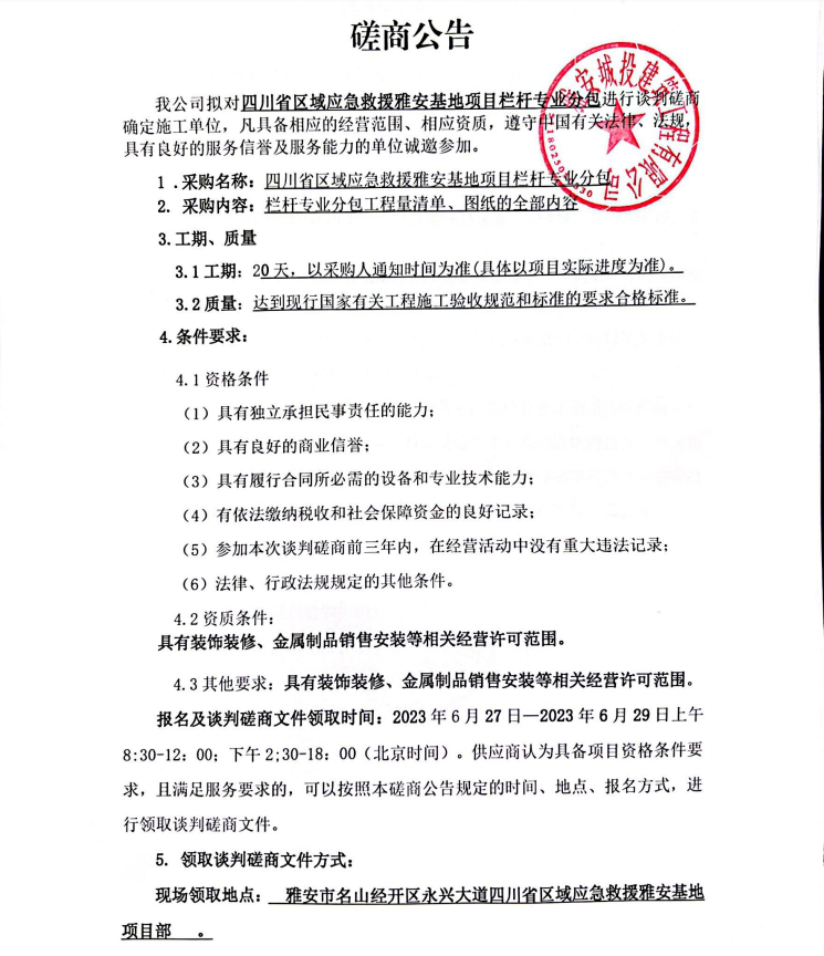 四川省區(qū)域應(yīng)急救援雅安基地項(xiàng)目欄桿專(zhuān)業(yè)分包談判磋商公告