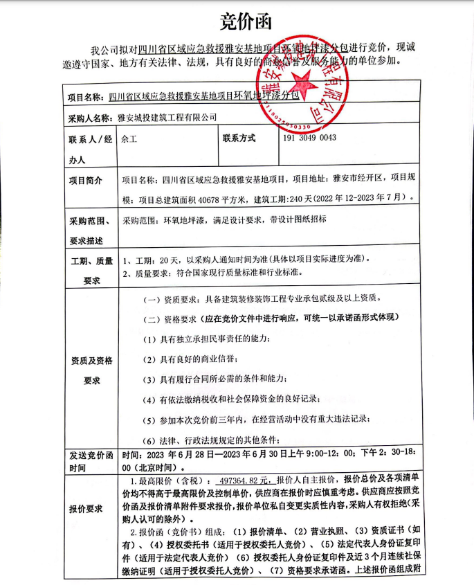 四川省區(qū)域應急救援雅安基地項目環(huán)氧地坪漆分包競價公告