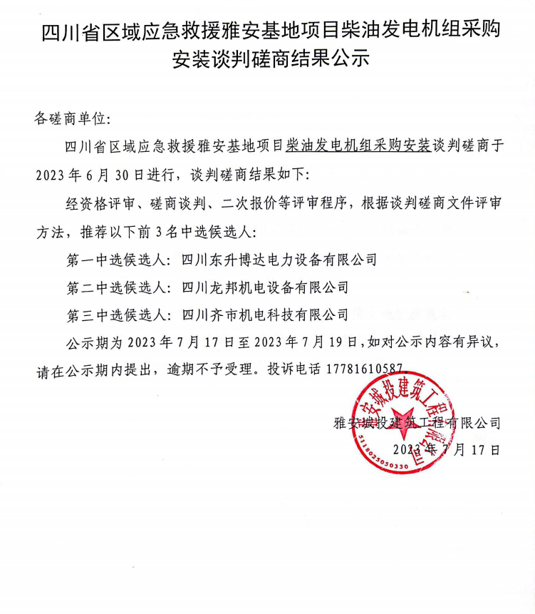 四川省區(qū)域應(yīng)急救援雅安基地項目柴油發(fā)電機(jī)組采購安裝談判磋商結(jié)果公示