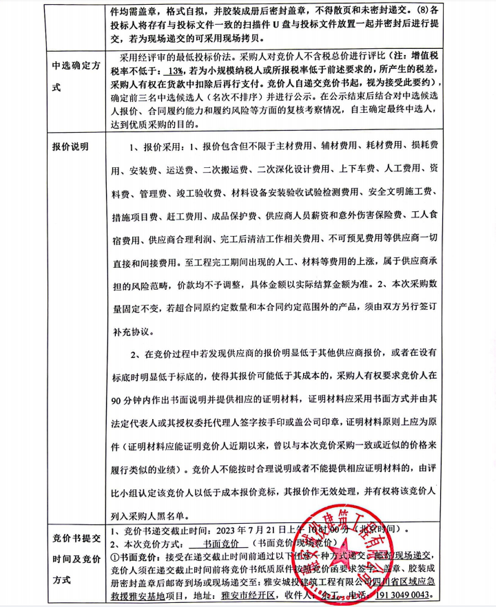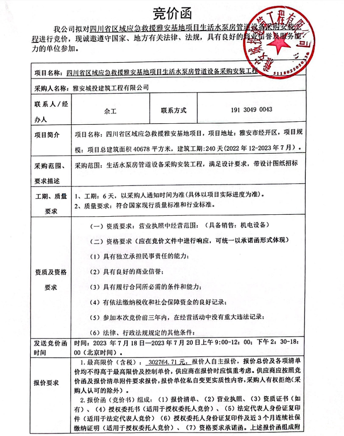 四川省區(qū)域應(yīng)急救援雅安基地項(xiàng)目生活水泵房管道設(shè)備采購安裝工程競價公告