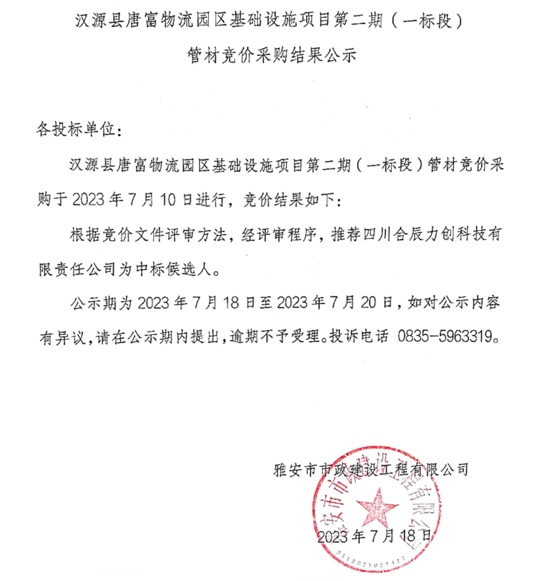漢源縣唐富物流園區(qū)基礎(chǔ)設(shè)施項目二期(一標(biāo)段)管材競價采購結(jié)果公示