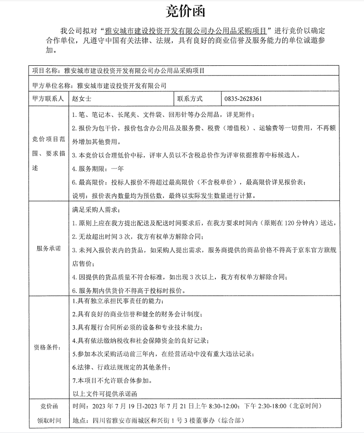 雅安城市建設投資開發(fā)有限公司辦公用品采購項目競價公告