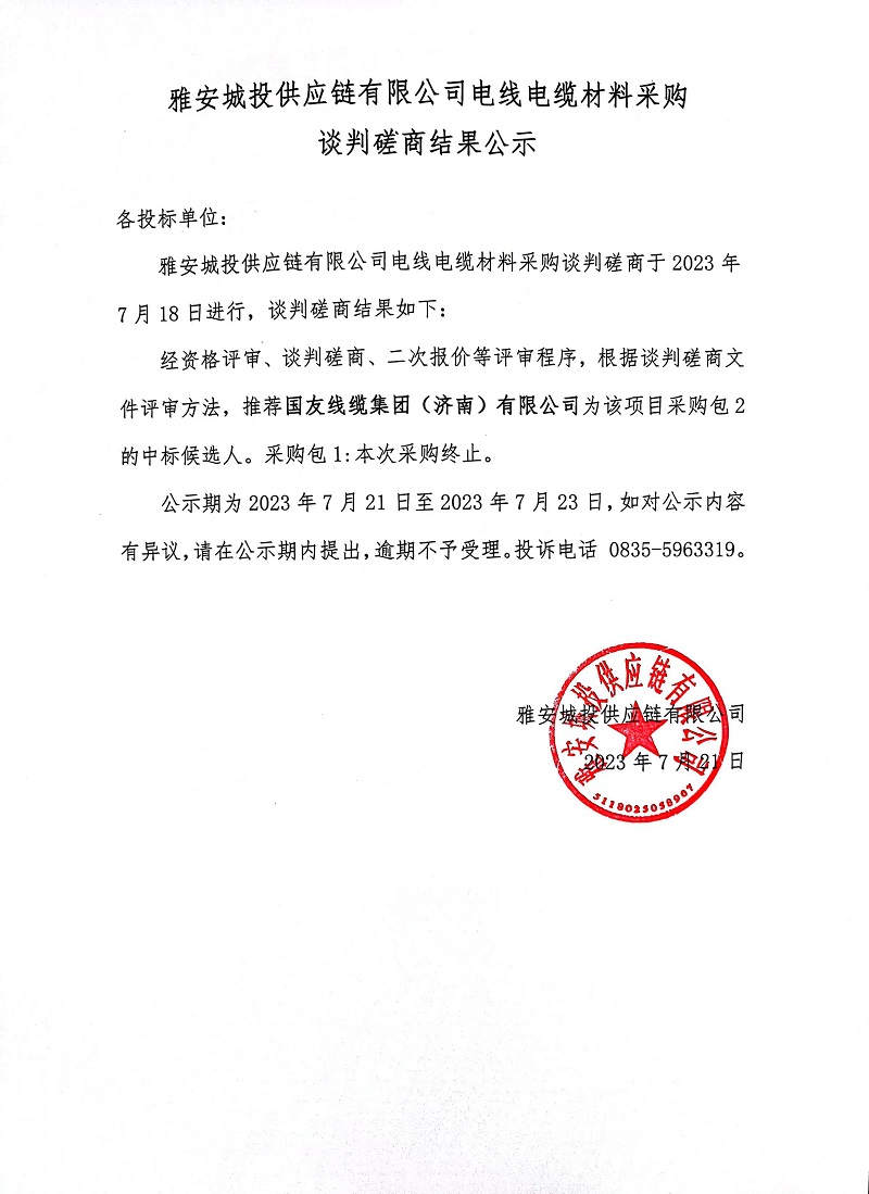 雅安城投供應(yīng)鏈有限公司電線電纜材料采購談判磋商結(jié)果公示