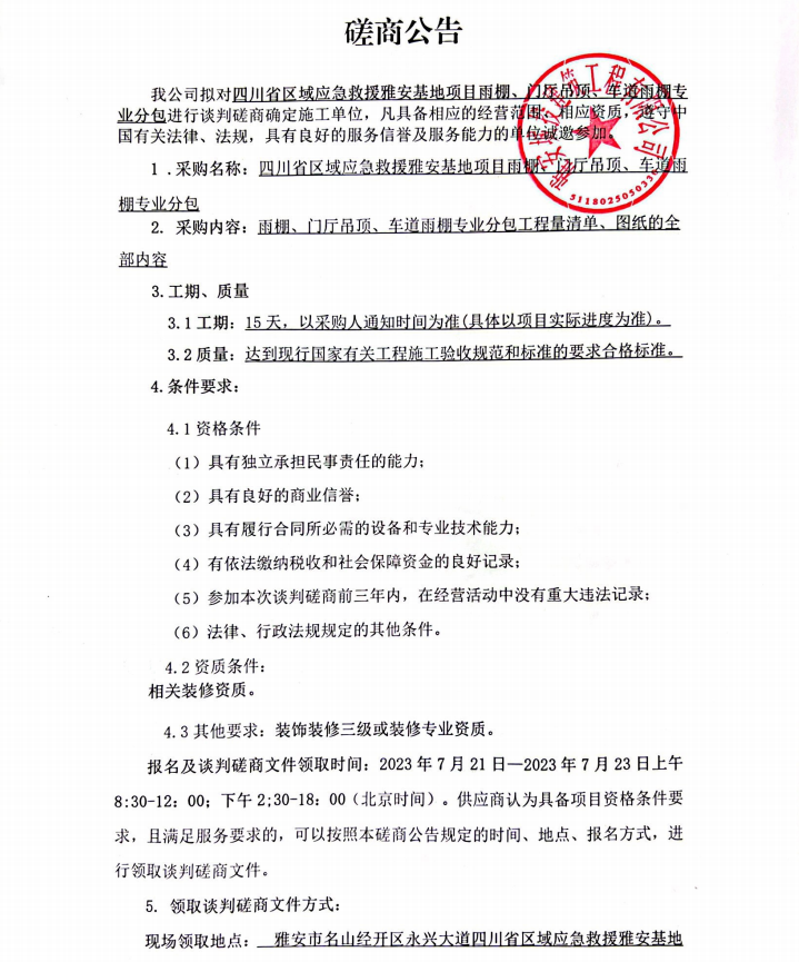 四川省區(qū)域應急救援雅安基地項目雨棚、門廳吊頂、車道雨棚專業(yè)分包談判磋商公告