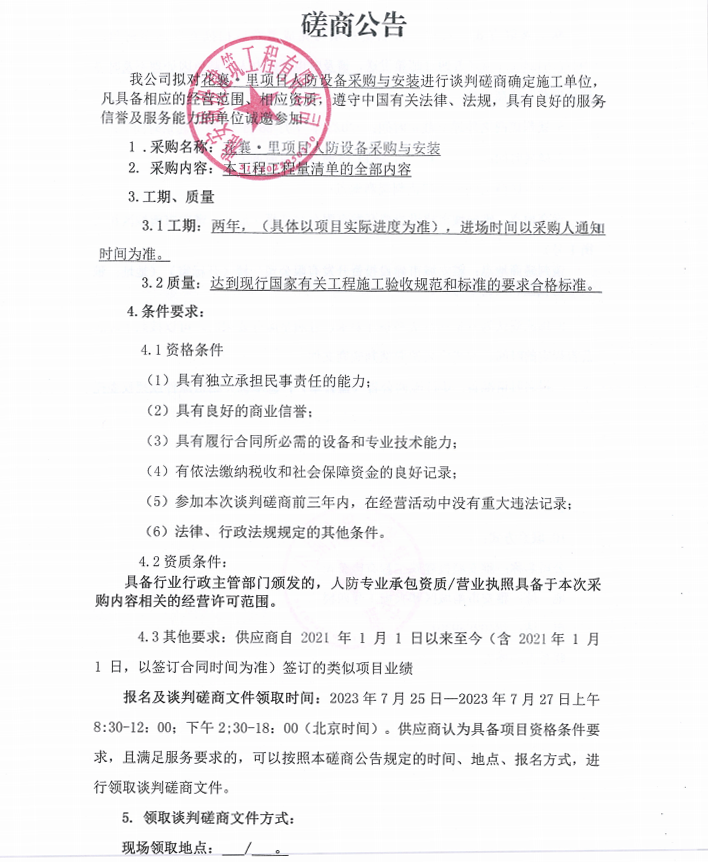 漢源縣花襄·里項(xiàng)目人防設(shè)備采購與安裝談判磋商公告