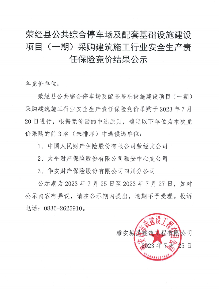 滎經(jīng)縣公共綜合停車(chē)場(chǎng)及配套基礎(chǔ)設(shè)施建設(shè)項(xiàng)目(一期)采購(gòu)建筑施工行業(yè)安全生產(chǎn)責(zé)任保險(xiǎn)競(jìng)價(jià)結(jié)果公示