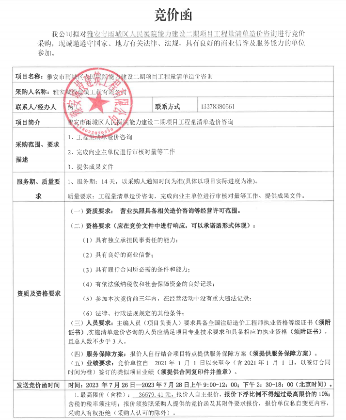 雅安市雨城區(qū)人民醫(yī)院能力建設二期項目工程量清單造價咨詢競價公告