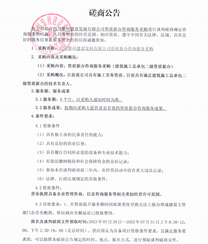 四川黎州建設(shè)發(fā)展有限公司資質(zhì)新辦咨詢服務(wù)采購談判磋商公告