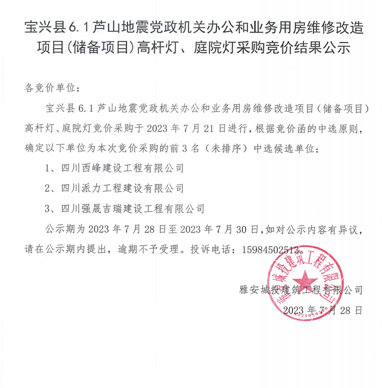 寶興縣6.1蘆山地震黨政機(jī)關(guān)辦公和業(yè)務(wù)用房維修改造項(xiàng)目(儲(chǔ)備項(xiàng)目)高桿燈、庭院燈采購(gòu)競(jìng)價(jià)結(jié)果公示