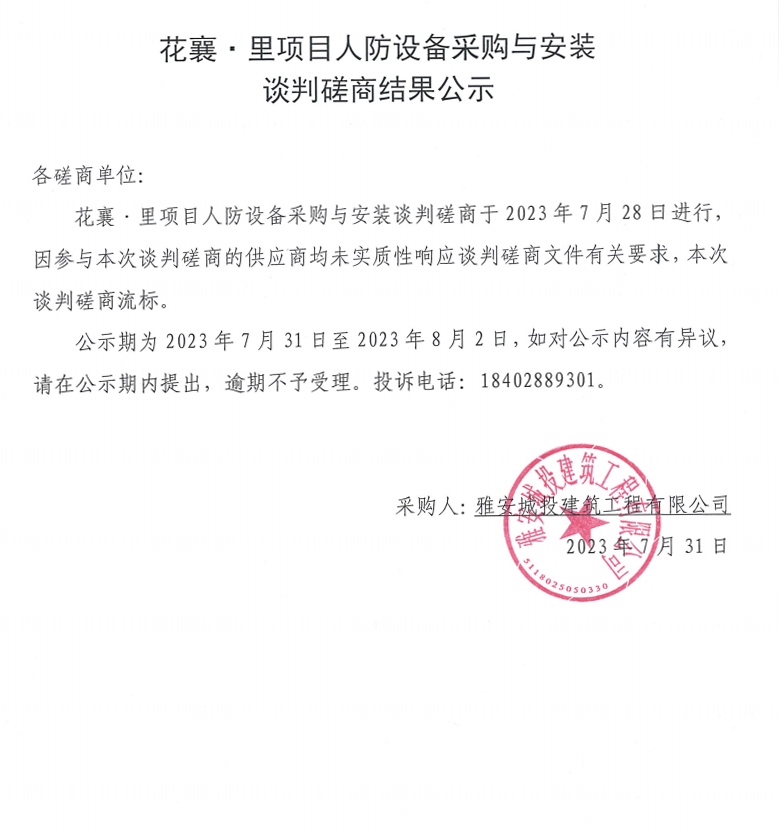 花襄·里項(xiàng)目人防設(shè)備采購與安裝談判磋商結(jié)果公示