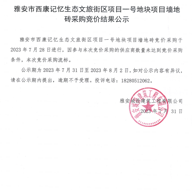 雅安市西康記憶生態(tài)文旅街區(qū)項目一號地塊項目墻地磚采購競價結果公示