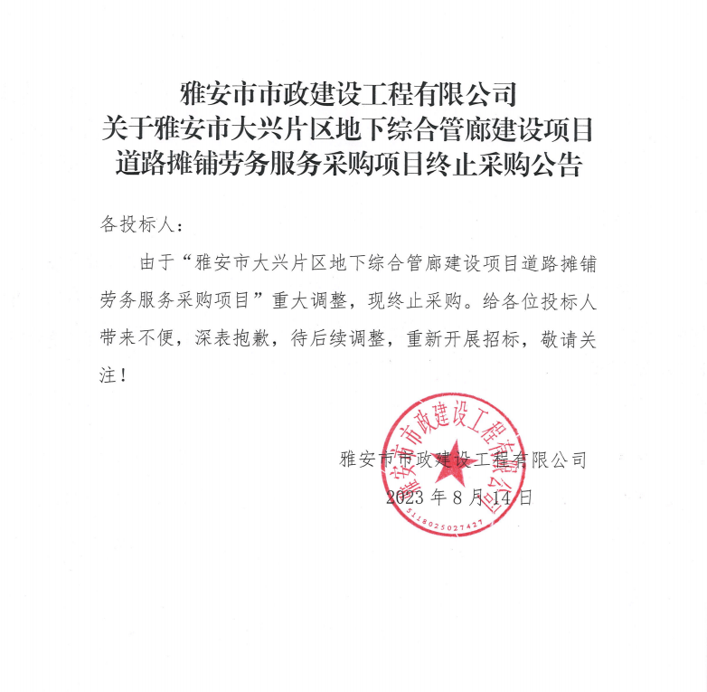 雅安市市政建設(shè)工程有限公司關(guān)于雅安市大興片區(qū)地下綜合管廊建設(shè)項(xiàng)目道路攤鋪勞務(wù)服務(wù)采購項(xiàng)目終止采購公告