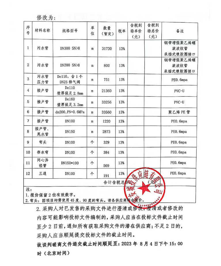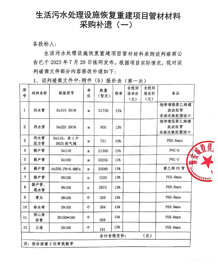 生活污水處理設(shè)施恢復(fù)重建項(xiàng)目管材材料采購補(bǔ)遺(一)