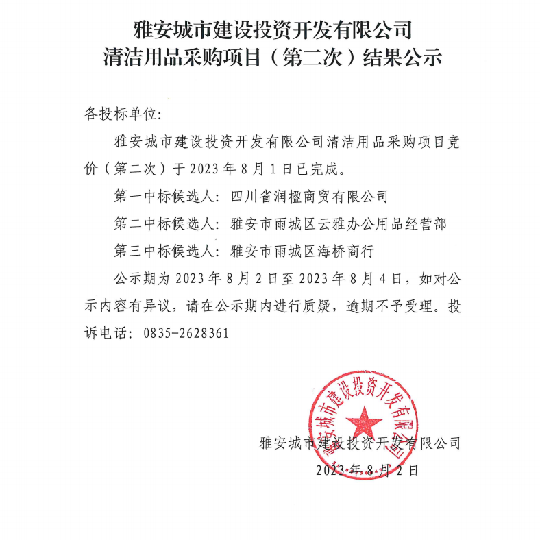 雅安城市建設投資開發(fā)有限公司清潔用品采購項目(第二次)結(jié)果公示