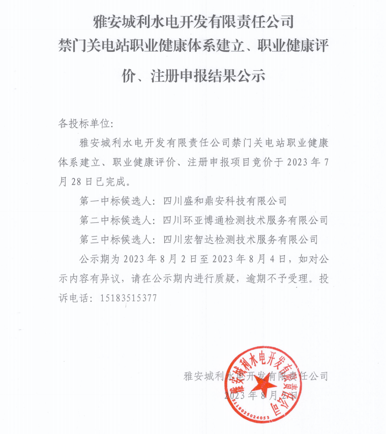 雅安城利水電開發(fā)有限責(zé)任公司禁門關(guān)電站職業(yè)健康體系建立、職業(yè)健康評(píng)價(jià)、注冊(cè)申報(bào)結(jié)果公示