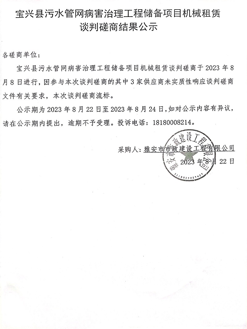 寶興縣污水管網(wǎng)病害治理工程儲備項(xiàng)目機(jī)械租賃談判磋商結(jié)果公示