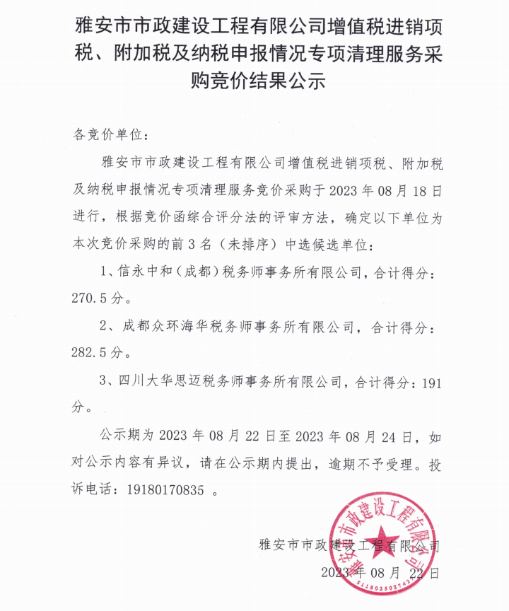 雅安市市政建設(shè)工程有限公司增值稅進銷項稅、附加稅及納稅申報情況專項清理服務(wù)采購競價結(jié)果公示