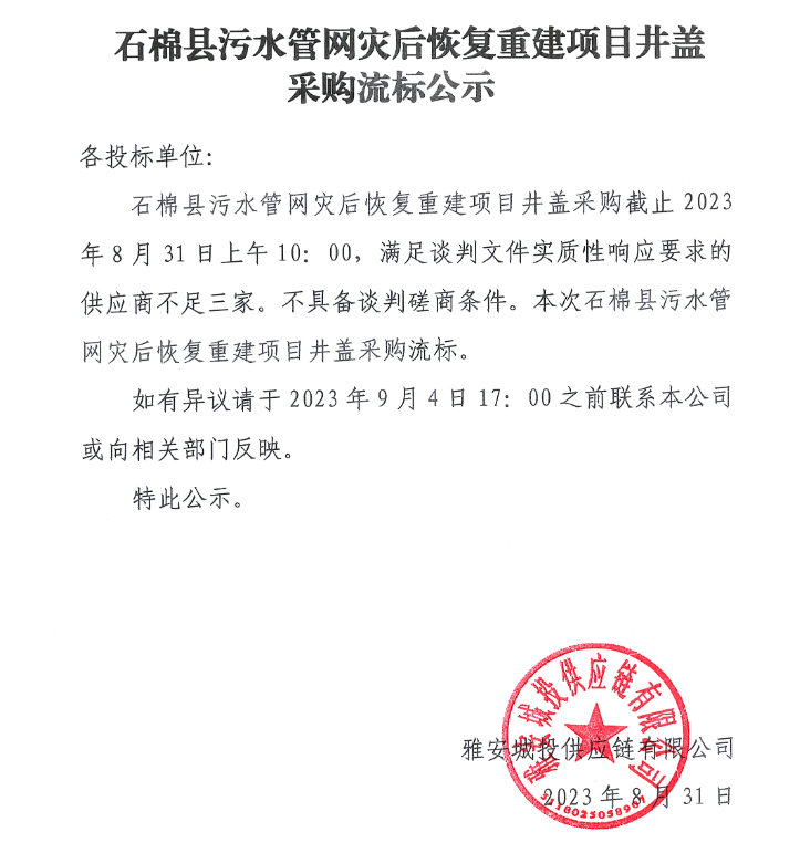 石棉縣污水管網(wǎng)災(zāi)后恢復(fù)重建項目井蓋采購流標(biāo)公示