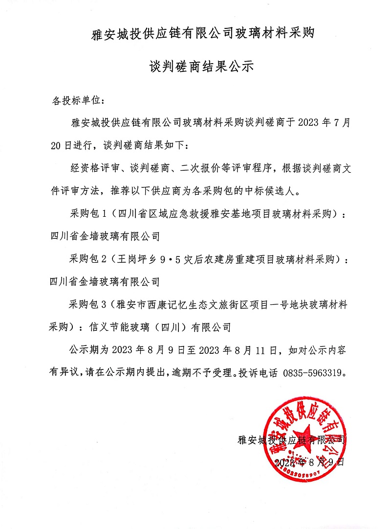 雅安城投供應鏈有限公司玻璃材料采購談判磋商結(jié)果公示