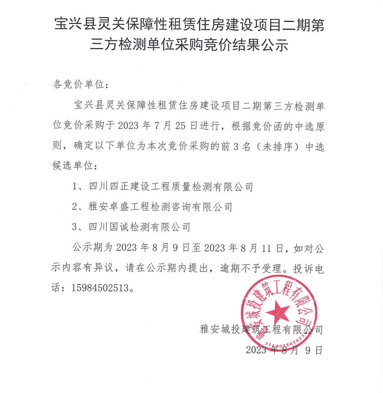 寶興縣靈關(guān)保障性租賃住房建設項目二期第三方檢測單位采購競價結(jié)果公示