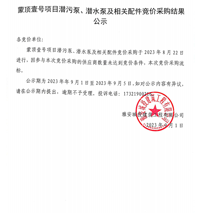 蒙頂壹號項目潛污泵、潛水泵及相關配件競價采購結果公示