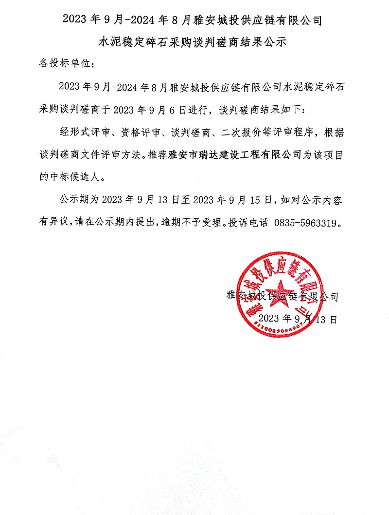 2023年9月-2024年8月雅安城投供應(yīng)鏈有限公司水泥穩(wěn)定碎石采購談判磋商結(jié)果公示