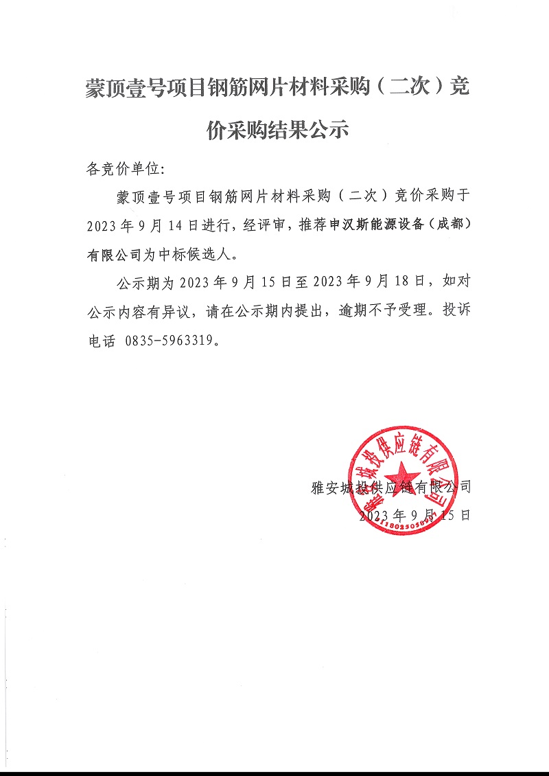 蒙頂壹號(hào)項(xiàng)目鋼筋網(wǎng)片材料采購(gòu)(二次)競(jìng)價(jià)采購(gòu)結(jié)果公示