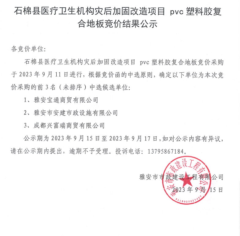 石棉縣醫(yī)療衛(wèi)生機(jī)構(gòu)災(zāi)后加固改造項目pvc塑料膠復(fù)合地板采購競價結(jié)果公示
