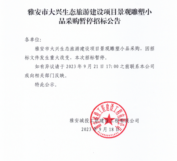 雅安市大興生態(tài)旅游建設(shè)項(xiàng)目景觀雕塑小品采購暫停招標(biāo)公告